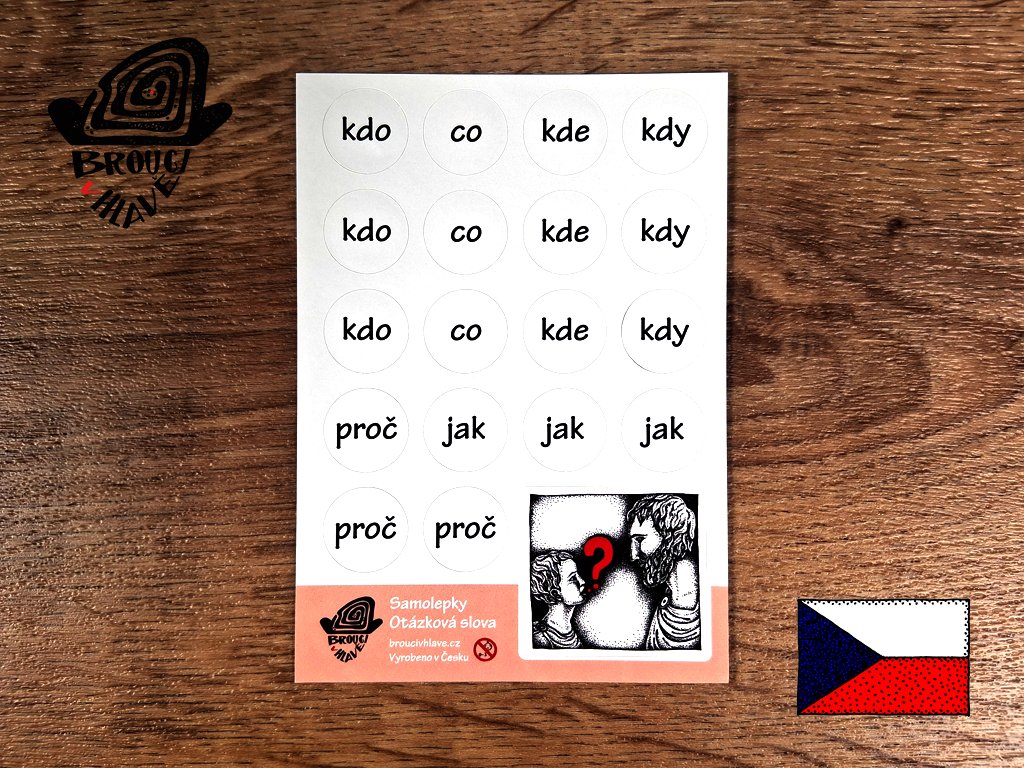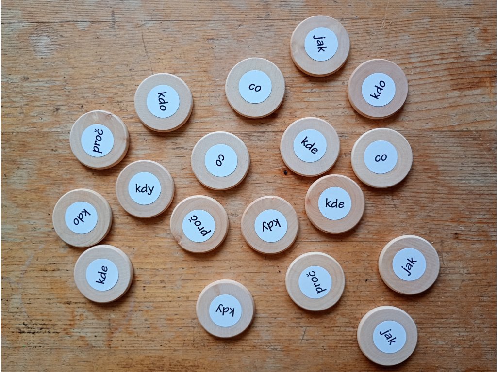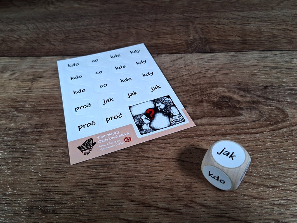 Tyto samolepky jsou připraveny nejen pro výuku češtiny jako druhého jazyka, ale také pro čtenářské dílny a obecně rozvíjení porozumění a práce s textem. Velikost kulatých samolepek odpovídá velikosti dřevěných kostek, můžete si tedy vytvořit svoje vlastní kostky k procvičování tvorby otázek. Samolepky ale můžete nalepit také do sešitu či na jiné předměty jako jsou malé dřevěné kotouče, které pak můžete použít k losování.