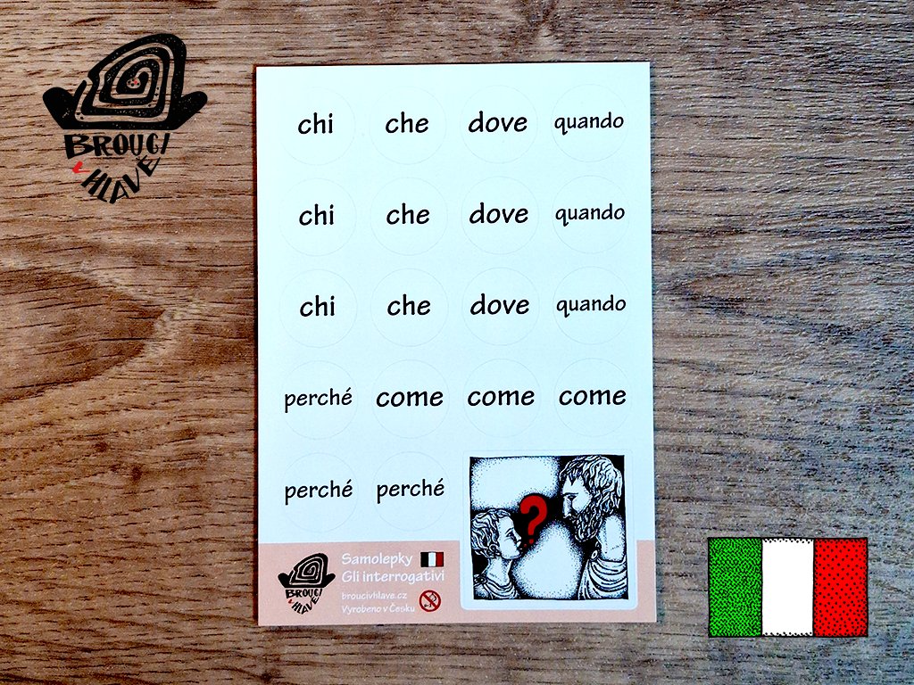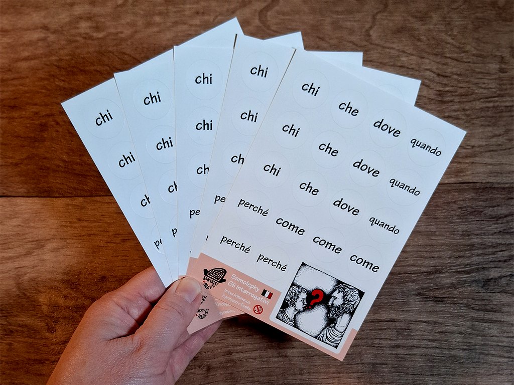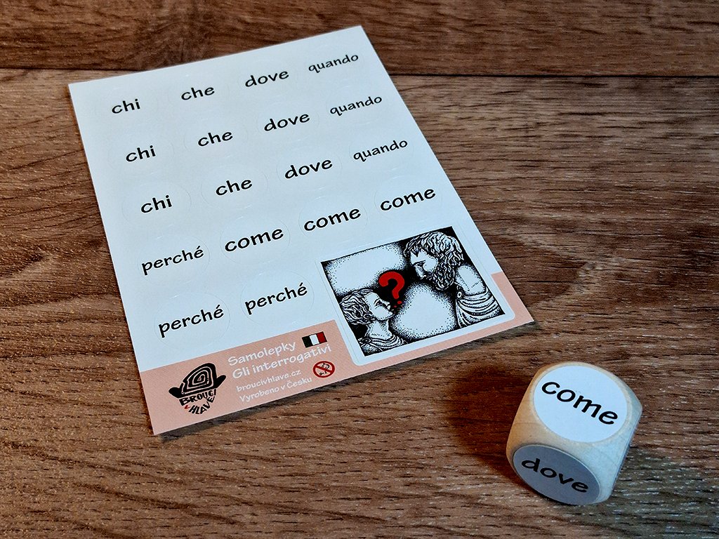 Tyto samolepky jsou připraveny pro výuku italštiny a poslouží nejen začátečníkům, ale také pokročilým studentům i rodilým mluvčím v práci s textem. Velikost kulatých samolepek odpovídá velikosti dřevěných kostek, můžete si tedy vytvořit svoje vlastní kostky k procvičování tvorby otázek. Samolepky ale můžete nalepit také do sešitu či na jiné předměty jako jsou malé dřevěné kotouče, které pak můžete použít k losování.